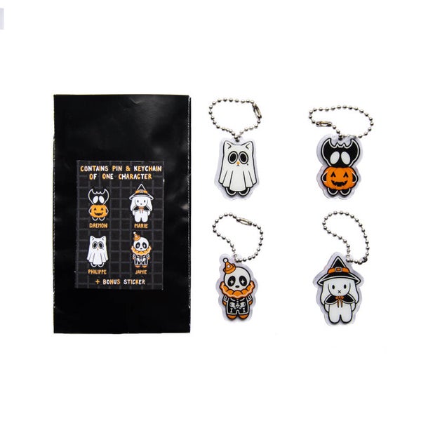 Celebrate the spooky season with a Trick or Treat mystery pack. Each pack contains a pin and a mini-keychain of one of the four characters, as well as a bonus sticker of all the little guys going out for trick or treating. There will only be 40 mystery packs available.